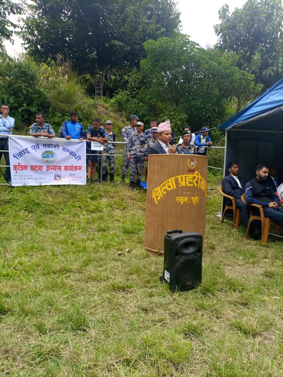 जिल्ला विपद् व्यवस्थापन समिति, रुकुम (पूर्वी भाग)को आयोजनामा आज मिति २०८०/०६/१५ गते रुकुमकोट कमलदहमा विपद् पूर्व तयारी सम्बन्धी कृत्रिम घटना अभ्यास कार्यक्रम