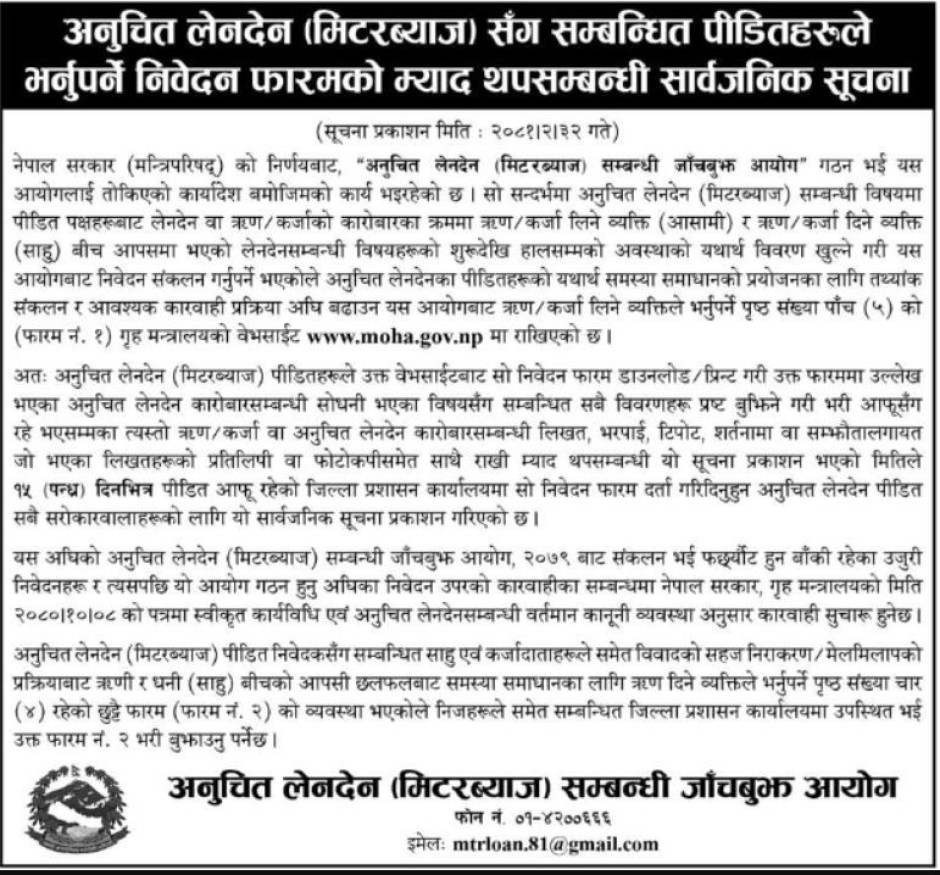 अनुचित लेनदेन (मिटरव्याज) सँग सम्बन्धित पीडितहरुले उजुरी/निवेदन दिने म्याद थप सम्बन्धी सार्वजनिक सूचना