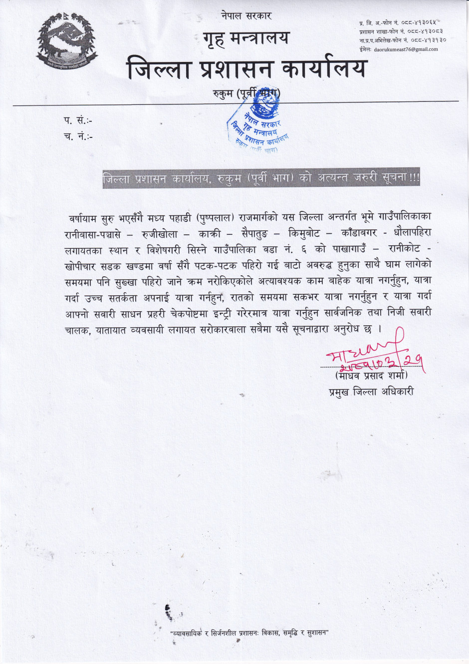 तस्बिर : जिल्ला प्रशासन कार्यालय, रुकुम (पूर्वी भाग) को अत्यन्त जरुरी सूचना