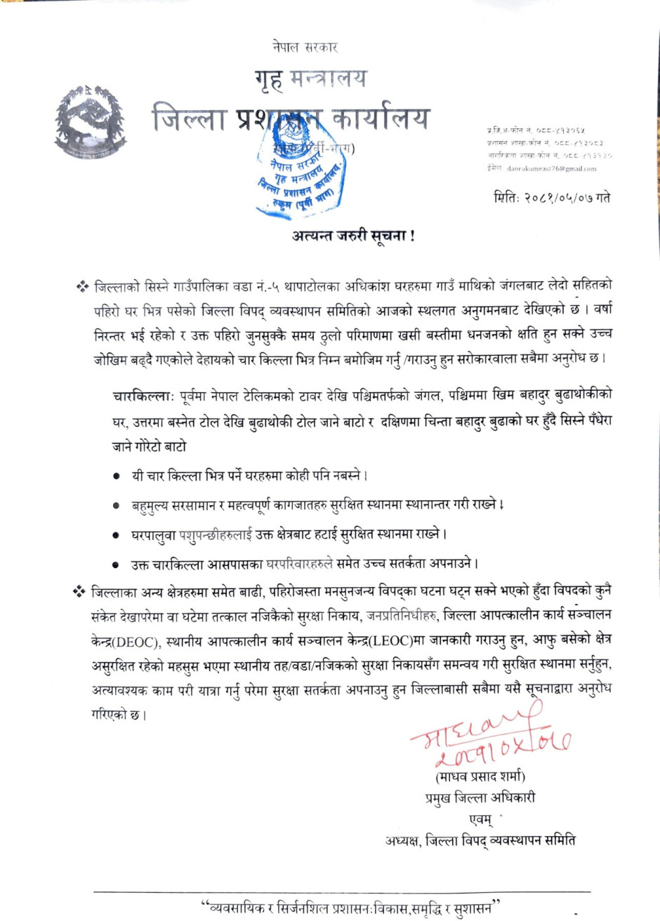 जिल्ला प्रशासन कार्यालय, रुकुम (पूर्वी भाग) को अत्यन्त जरुरी सूचना