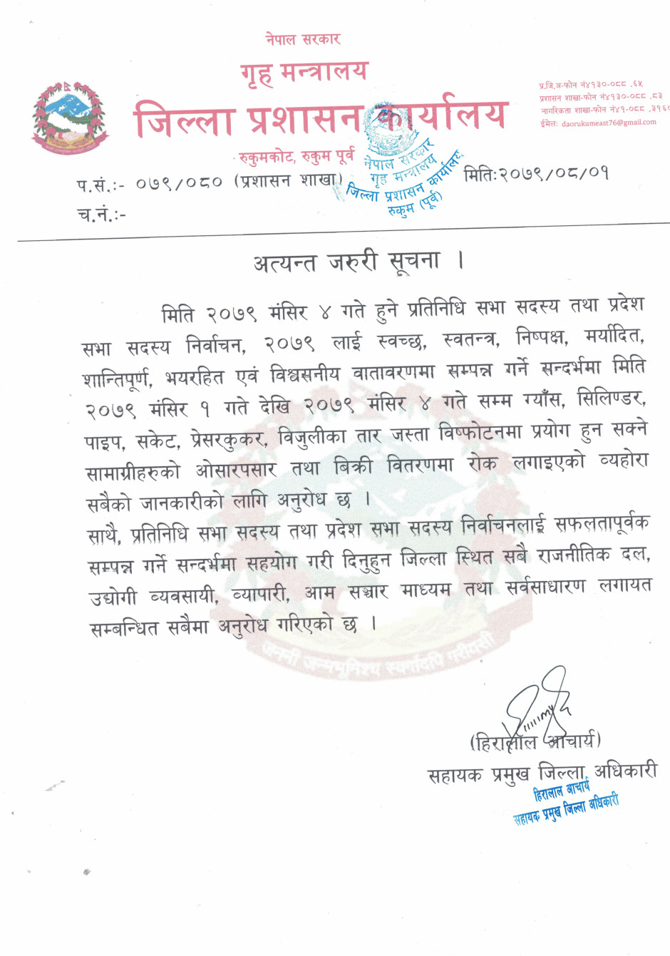 तस्बिर : जिल्ला प्रशासन कार्यालय रूकुम पूर्वबाट जारी अत्यन्त जरूरी सूचना
