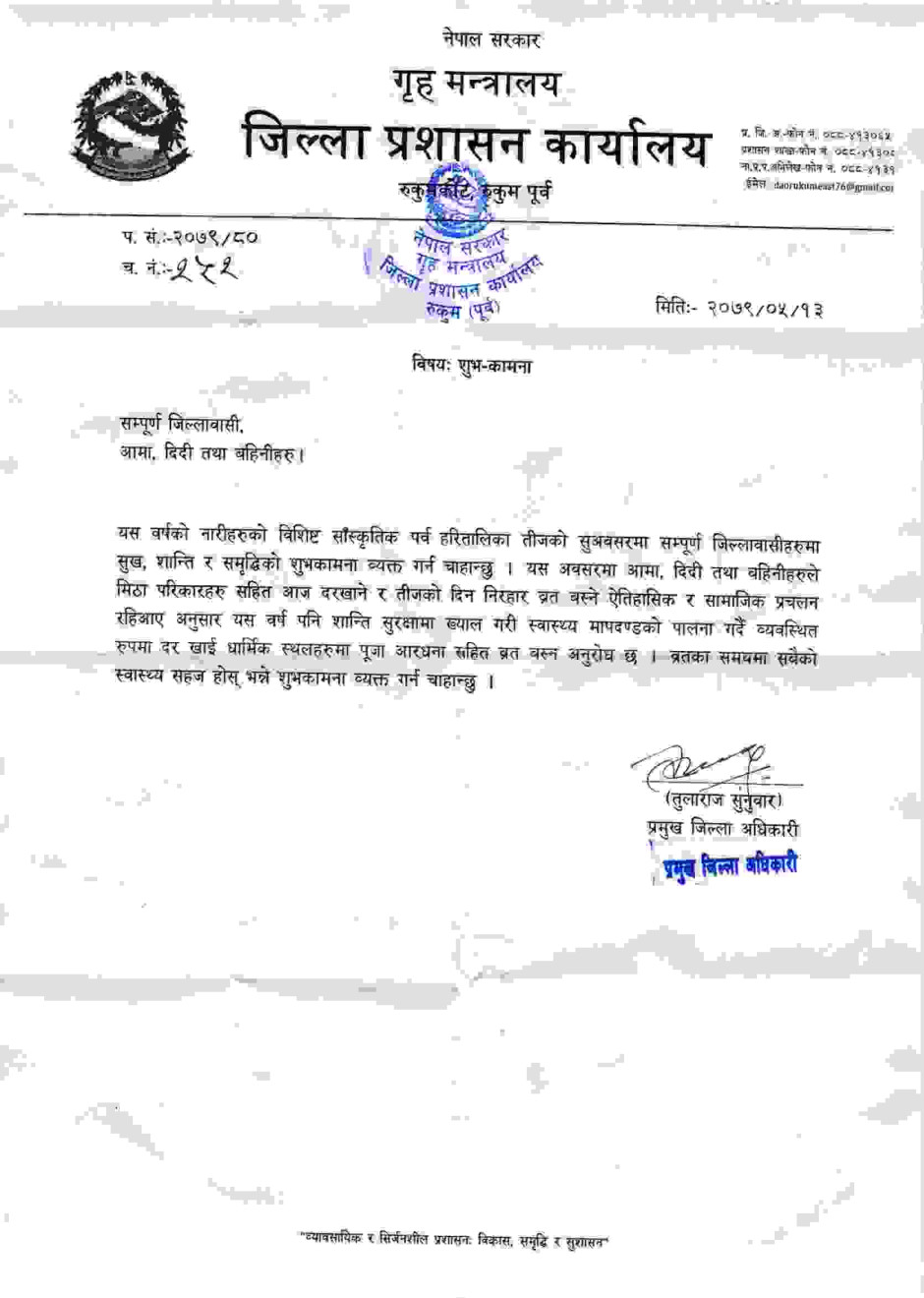 जिल्ला प्रशासन कार्यालय, रुकुम पूर्वको हरितालिका तिजको शुभकामना