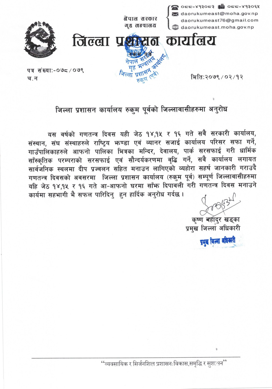 तस्बिर : जिल्ला प्रशासन कार्यालय, रुकुम पूर्वको जिल्लावासीमा अनुरोध