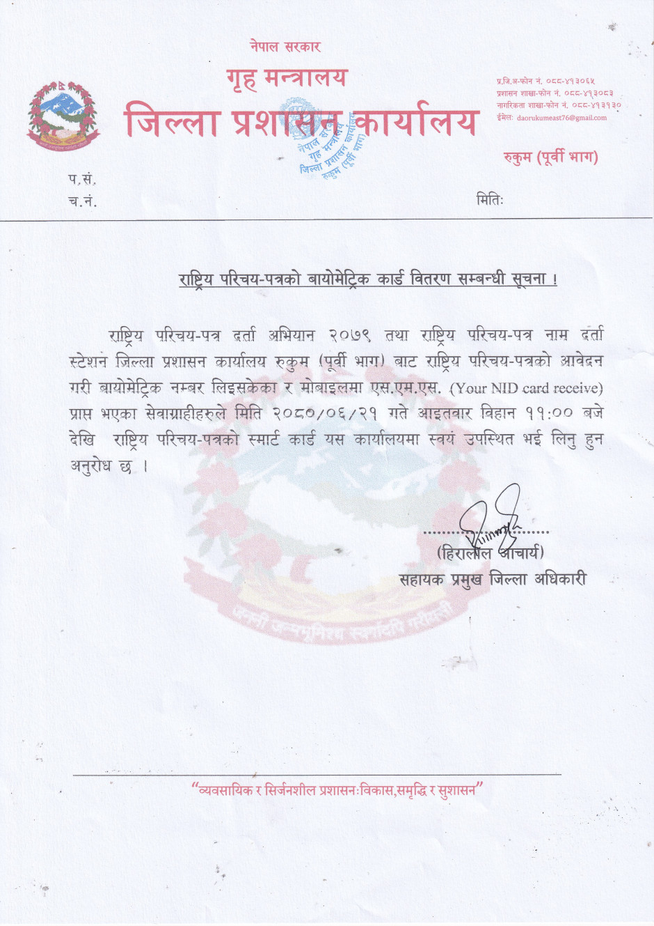 राष्ट्रिय परिचयपत्रको वायोमेट्रिक कार्ड वितरण सम्बन्धी सूचना