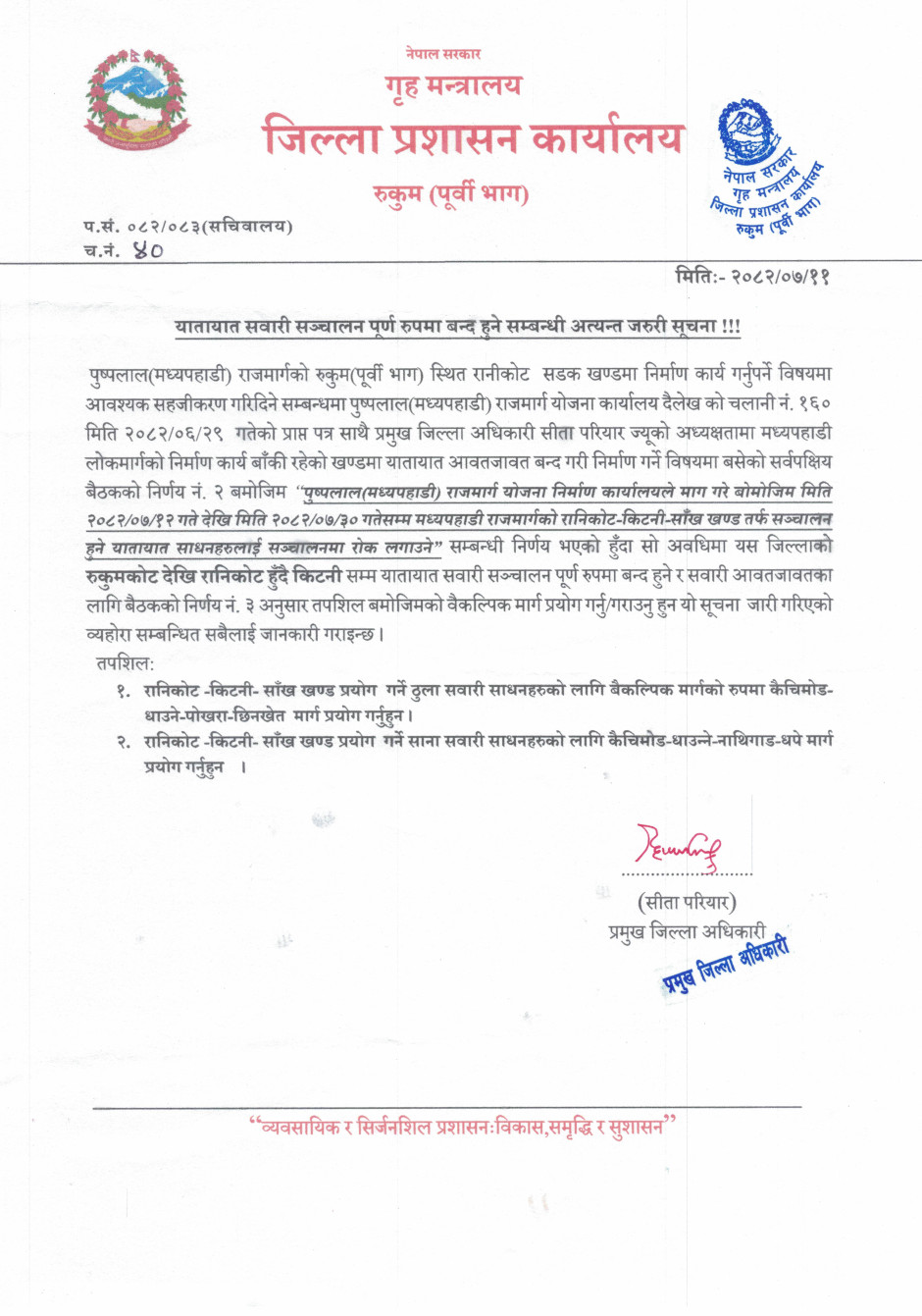 यातायात सञ्चालन पूर्ण रुपमा बन्द हुने अत्यन्त जरुरी सूचना ।